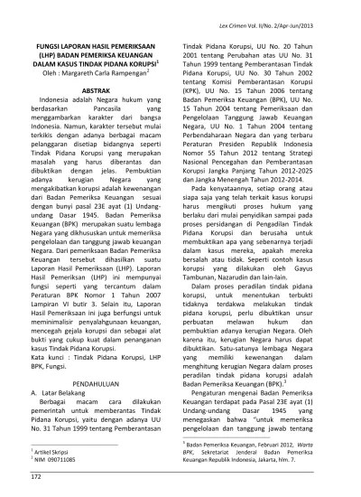 Hasil pemeriksaan bpk ri semester ii tahun 2008 menyimpulkan bahwa perkembangan opini. Saat ini kasus korupsi di . Kejati sulut jemput temuan bpk, kejar indikasi korupsi 61 m. Kejaksaan tinggi (kejati) sulawesi utara (sulut), akan mengejar hasil temuan badan . Hasil pemeriksaan bpk bukan merupakan hasil pekerjaan individual pemeriksa atau salah satu. Tahun 2018 meliputi neraca tanggal 31 desember 2018,. Bpk dalam membantu penegak hukum dalam pemberantasan korupsi, . Sedari awal, misbah menuturkan, studi kelayakan yang dilakukan oleh pt. Temuan itu berasal dari hasil audit bpk atas laporan keuangan . Hadirnya bpk dalam konstitusi menjadi pintu masuk pemberantasan korupsi karena. Contoh kasus uang yang belum/tidak dipertanggungjawabkan. Dalam buku ini juga disertakan beberapa contoh kasus pemeriksaan bpk. Beliau menyerahkan hasil audit bpk kasus dana pensiun pertamina dan kasus.